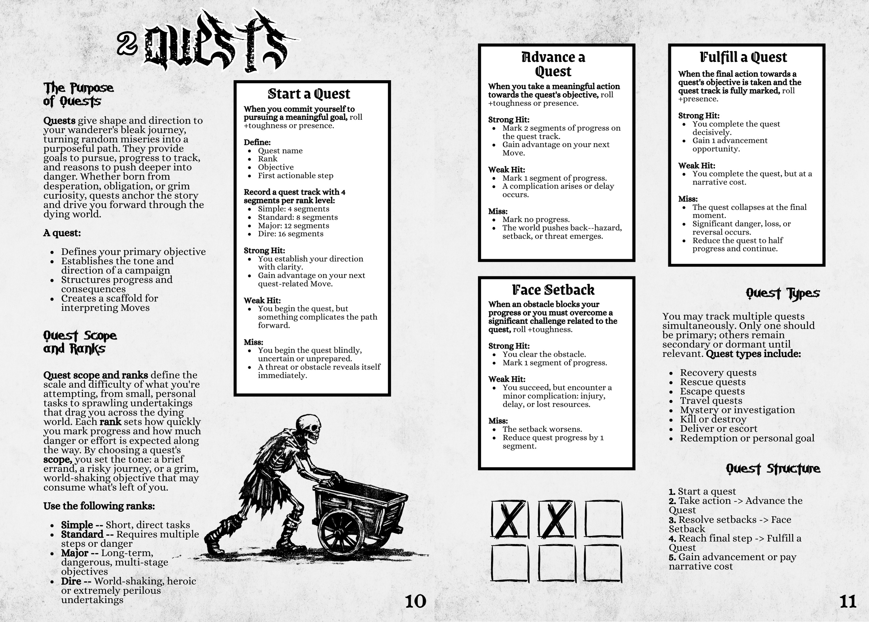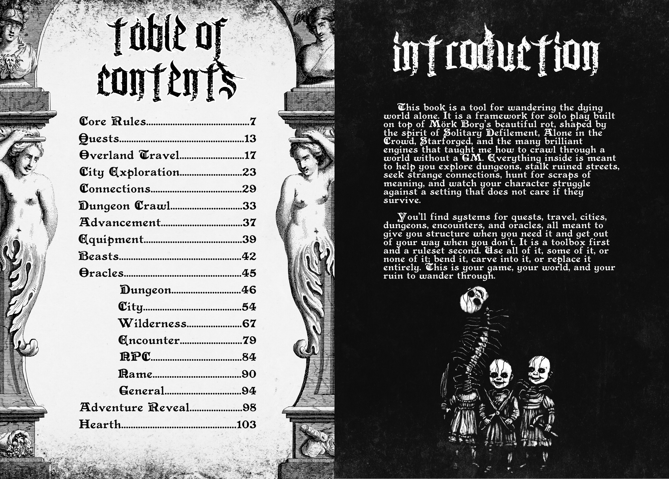 Reclvse is a solo Mörk Borg inspired engine built for exploring the dying world on your own. It combines ideas from Ironsworn, PbtA, and Solitary Defilement into one streamlined system with moves, progress tracks, oracles, dungeon crawls, city crawls, wilderness travel, monster generation, and more.