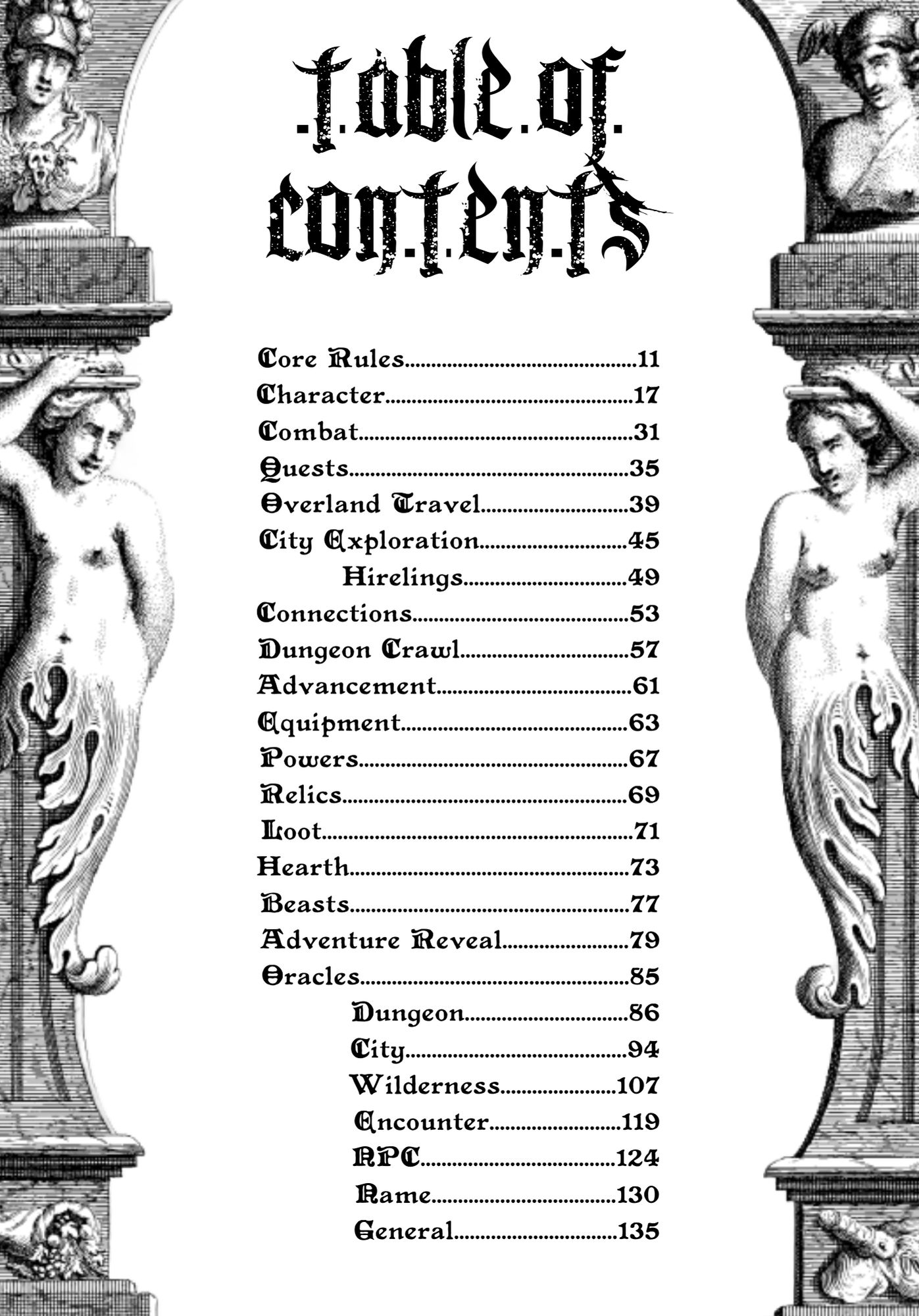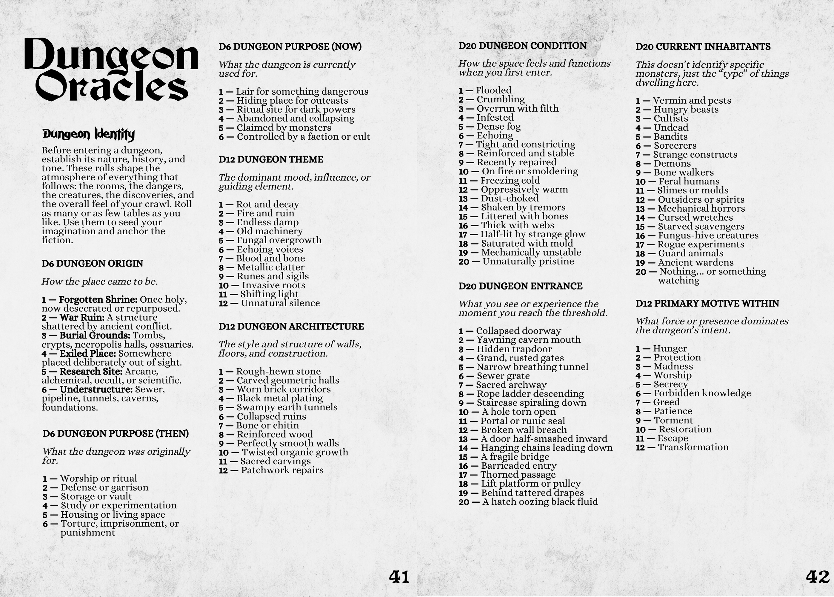 Pg 50 - check the numbering of the Quick Room Generator tables. Seem to be missing table #3. Also, do you roll on table #1 twice (first for size, and then a second time for shape?)